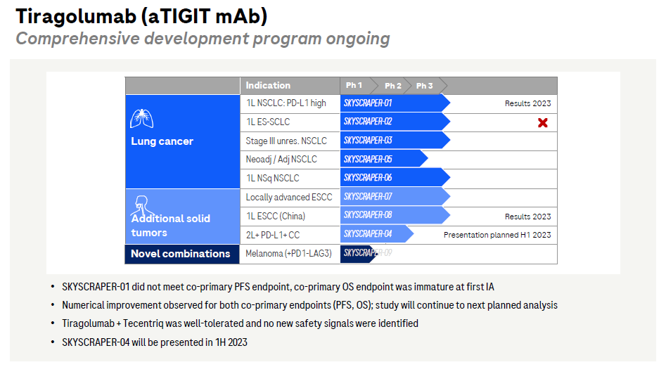 的疗效和安全性。据罗氏近期临床里程碑的披露,2023H1 或将公布 SKYSCRAPER-01 试验结果,届时 OS 结果有望出炉。罗氏表示,在中期分析中就已经观察到了共同主要重点 PFS 和 OS 在数值上的改善。