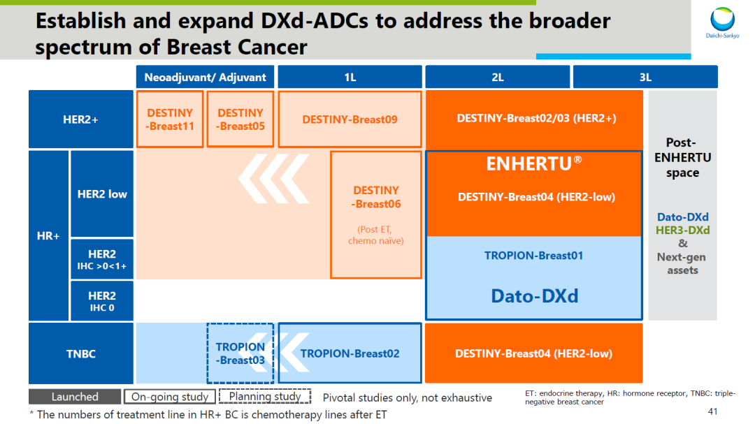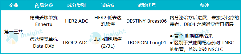 第一三共在 ADC 领域十分强势。今年凭借 Enhertu 在 HER2 低表达乳腺癌的突破性研究 DESTINY-Breast04