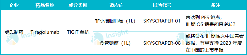 作为首个 TIGIT 单抗,Tiragolumab 的一举一动备受关注。今年其小细胞肺癌和非小细胞肺癌两项 III 期临床先后宣布未达到 PFS 主要终点,这无疑为 TIGIT 靶点的研发泼上了一盆冷水。不过故事并未结束,因为针对 NSCLC 的 SKYSCRAPER-01 研究还在继续进行,等待 OS 数据的证明。
