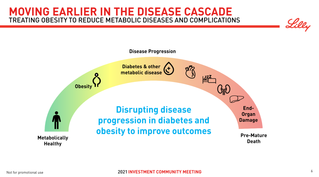 引用礼来在 2021 投资者日中的 PPT,糖尿病和肥胖症是多种代谢疾病的潜在因素,因而在代谢领域进行布局的企业往往可考虑串联多种相关疾病做全面的布局,不断增强加厚产品的覆盖范围和竞争力。