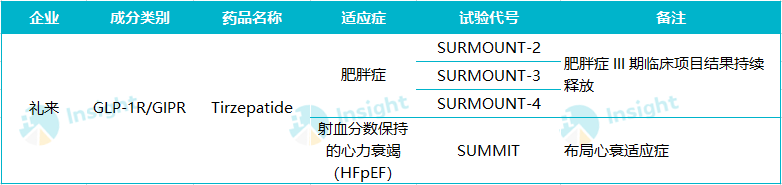 Tirzepatide 在减重领域主要布局了 6 项 III 期临床,包括 SURMOUNT-1~4 以及在中国和日本开展的 SURMOUNT-CN 和 SURMOUNT-J。除此之外还包括针对肥胖相关并发症的 SURMOUNT-OSA 和 SURMOUNT-MMO。