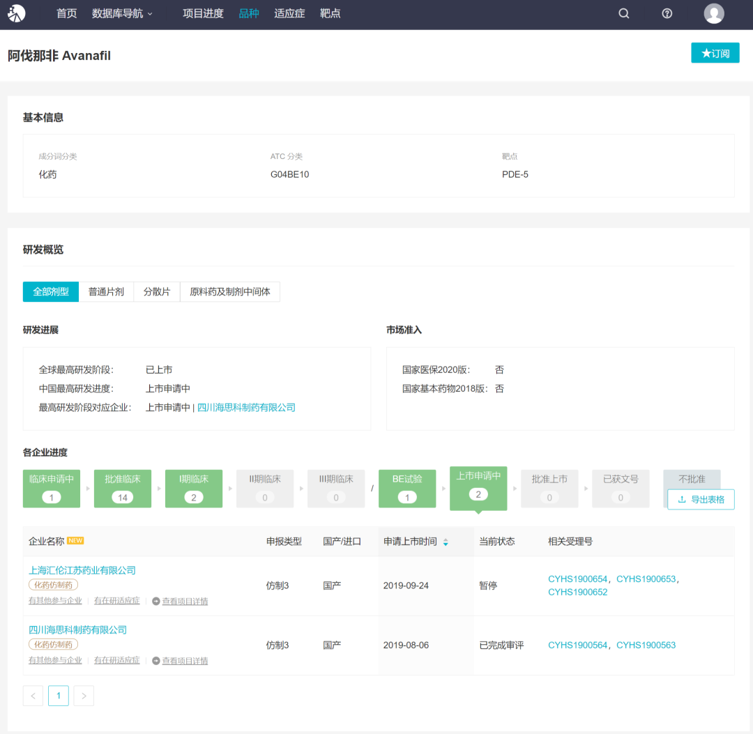 MPA 官网显示,四川海思科制药的 3 类仿制药阿伐那非片上市申请(受理号:CYHS1900563/4)已进入「在审批」状态,近日即将获批,成为首仿也是国内首家获批上市的阿伐那非片。
