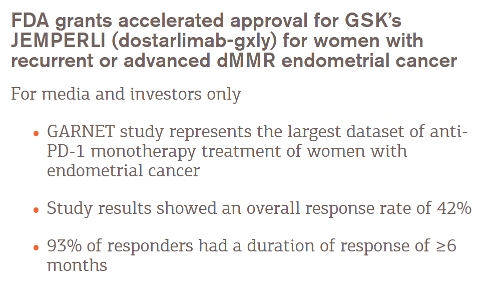 4月22日,GSK宣布FDA已加速批准其抗PD-1抗体Jemperli (dostarlimab)上市,用于治疗此前接受含铂化疗后疾病进展,且存在DNA错配修复缺陷(dMMR)的成人复发性或晚期子宫内膜癌。该项适应症的完全批准将取决于验证性试验中临床获益的评估。