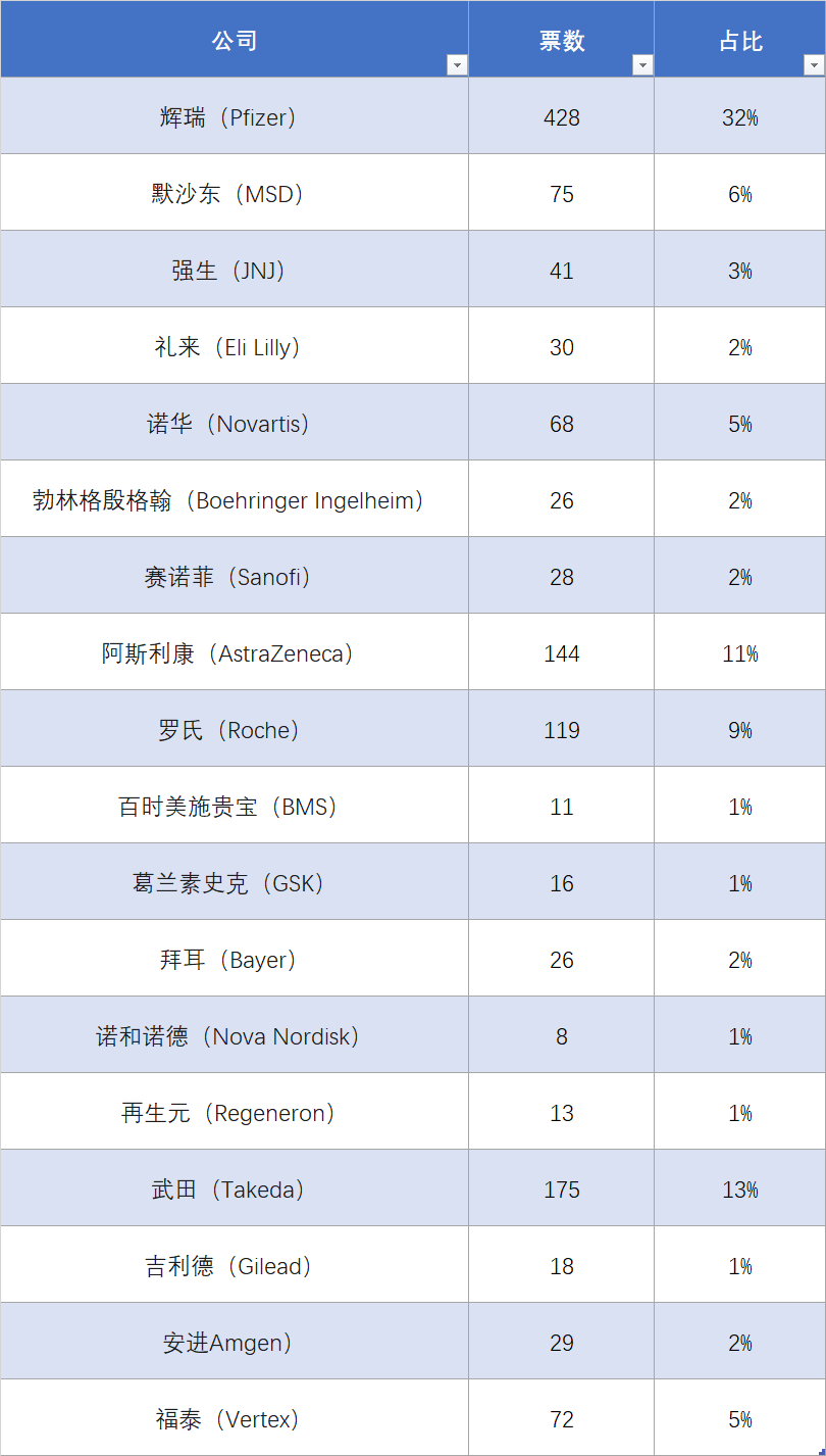 1327位朋友投票。 辉瑞以428票名列第一 ,占比32%。武田以175票(占比13%)位列第二。阿斯利康以144票(占比11%)位列第三。