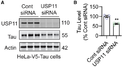 为验证上述假设,研究人员将阿兹海默病患者的脑组织切片进行免疫荧光染色,并设置没有痴呆症的对照组。首先,通过稳定表达野生型(WT)tau的HeLa细胞(HeLa-V5-tau,0N4R)中进行功能性siRNA筛选,研究者发现降低USP11或USP13的表达量均会导致tau水平显著降低。其中,敲低USP11可使tau水平降低约45%。同时,环己酰亚胺(CHX)实验表明,与对照siRNA相比,USP11显著提升了tau的数量。这一结果证明了USP11去泛素化酶是tau的正调节剂。