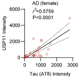 值得注意的是,雌激素会促进位于X染色体上的USP11表达,而USP11又会反过来调节女性在各个方面的生物学特征。因此,研究人员寻找了人脑中USP11性别二态性的证据。结果显示,与男性AD大脑相比,USP11积累与女性AD大脑中的tau病理呈现出显著的正相关,表明USP11积累是女性患AD风险比男性更高的重要驱动因素。而在无病的女性和雌性小鼠中,USP11表达比患病群体更高。