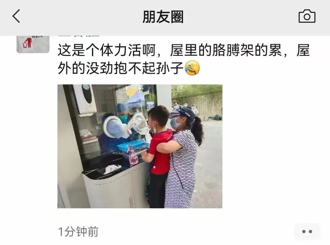 而在小屋外面,受检的群众同样不好受:由于高度受限,不少孩子只能被家长抱起来做核酸。还有一个视频显示:一个坐轮椅的老人来检测,几个人只好把他抬起来,以便他的嘴能凑近检测人员……