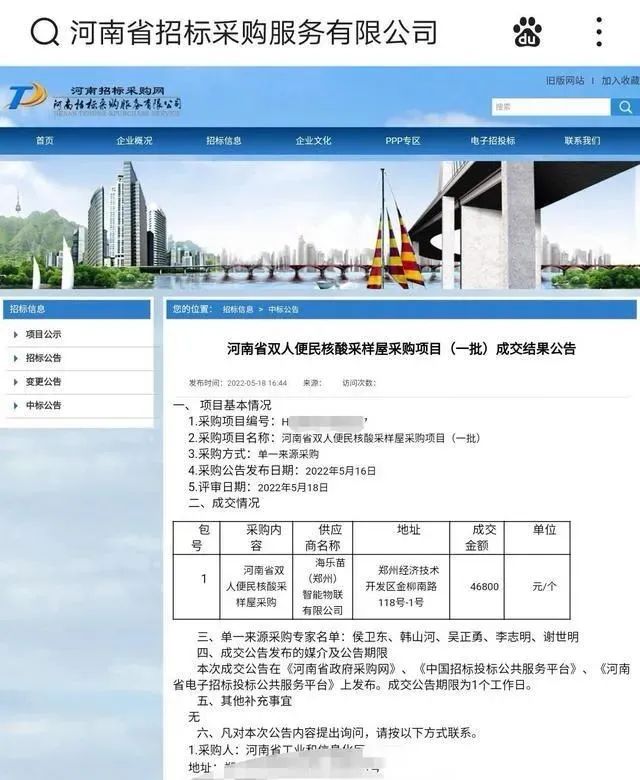 6月2日上午,法闻社登陆河南招标采购服务有限公司官网(河南招标采购网),发现河南省双人便民核酸采样屋采购项目(一批)和(二批)的“成交结果公告”,均已被悄然删除。