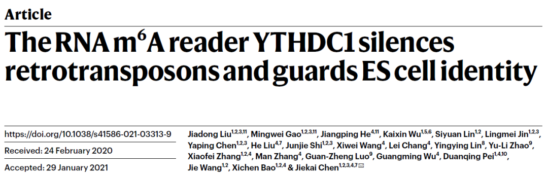 RNA m6A指导染色质沉默的新功能,证明逆转录转座元件转录的RNA可以通过m6A-YTHDC1机制募集SETDB1到相关染色质区域并参与细胞命运调控。
