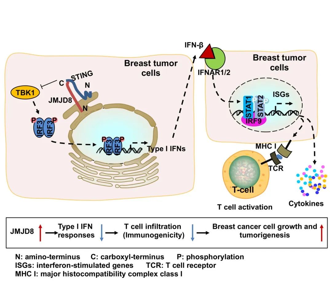 模式图:乳腺癌中高表达的JMJD8通过抑制STING-TBK1复合物从而抑制I型干扰素信号通路和抗肿瘤免疫反应,最终促进肿瘤生长。