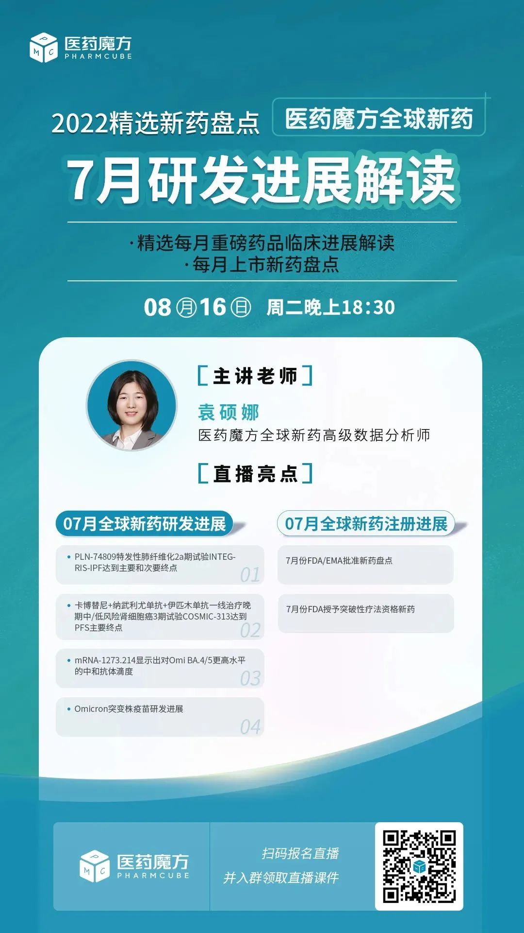 在此背景下,医药魔方基于对全球新药重要进展的梳理,推出全球新药--重要研发/注册进展的月度分享,与大家共同探讨未来全球新药的发展趋势。8月16日(周二)晚上18:30,医药魔方将为大家带来每月一次新闻盘点系列“2022年7月全球新药研发进展”的直播主题分享,欢迎关注全球研发趋势的医药行业人士一同前来直播间讨论交流。