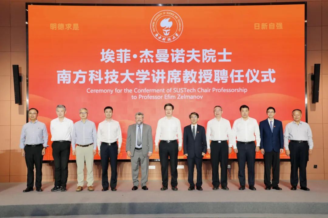 9 月 14 日,菲尔兹奖得主埃菲 · 杰曼诺夫从南方科技大学校长薛其坤手中接过聘任证书,正式成为南方科技大学讲席教授。