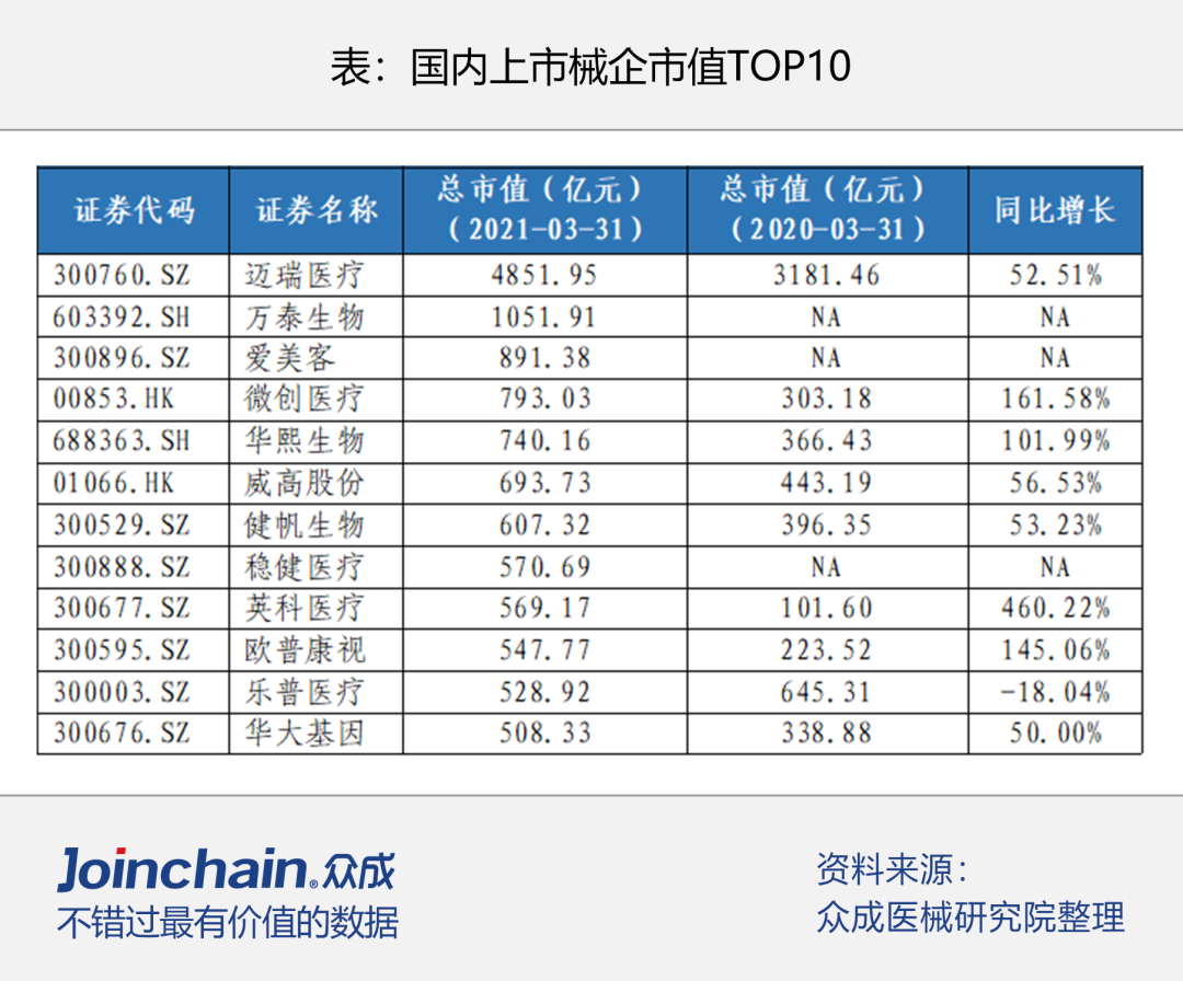 据统计,国内医疗器械上市企业总市值(2021年3月31日)同比增长超过40%。除迈瑞医疗外,万泰生物市值也突破千亿元,爱美客、微创医疗、华熙生物、威高股份、健帆生物、稳健医疗、英科医疗、欧普康视、乐普医疗和华大基因等市值均在500亿元以上。