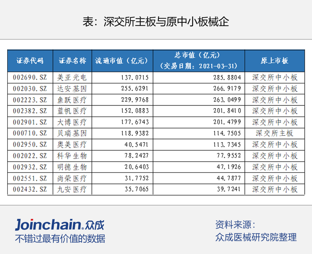 在医疗器械领域,自2004年至今登陆中小板的医疗器械企业达到10家,其中美亚光电、达安基因、鱼跃医疗、蓝帆医疗和大博医疗的总市值已超过200亿元。合并之后,深交所主板医疗器械达11家。未来深市主板不仅可以接纳原来在中小板上市的中小医疗器械企业,同时还可以接纳大中型医疗器械企业,深交所服务功能将进一步增强。
