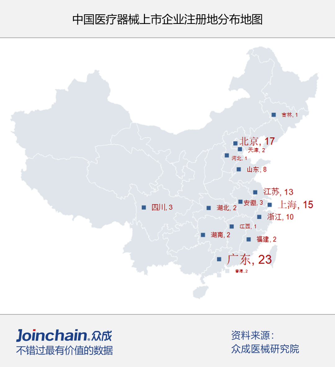 截至2021年3月底,根据众成医械研究院统计,国内医疗器械上市企业达108家(含A股、H股、美股,主营业务为医疗器械且具备医疗器械证)。东部沿海发达地区上市企业相对密集。其中,广东(23家)、北京(17家)、上海(15家)和江苏(13家)位居前四,浙江(10家)紧随其后。