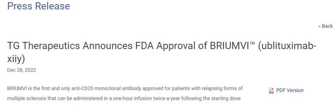 12月28日,TG Therapeutics公司宣布,其CD20单抗ublituximab新药上市申请获FDA批准,用于治疗复发型多发性硬化症(RMS)