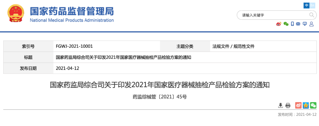 根据《国家药监局综合司关于开展2021年国家医疗器械质量抽查检验工作的通知》(药监综械管〔2021〕18号),现将2021年国家医疗器械抽检产品检验方案印发给你们,并将有关要求通知如下: