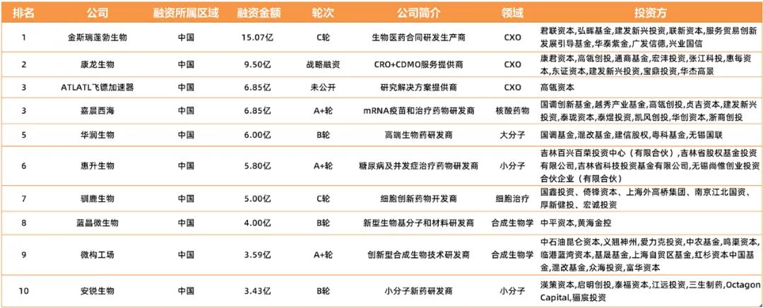 ▲ 2023 Q1中国生物医药融资额TOP 10 企业概况,数据来源:动脉橙