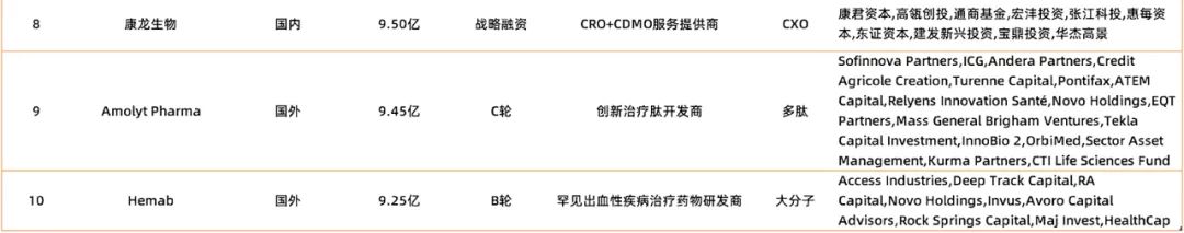 从成药形式来看,全球TOP 10企业中还是小分子居多,占三席;两家CXO入榜,都是国内企业,金斯瑞蓬勃生物、康龙生物分居第2、8位。此外我们看到更多的大额融资给到AI相关企业、基因编辑、细胞治疗、多肽等企业。成药形式和疾病领域都有机会获得大额资金,市场并没有压倒性的追在某一点。