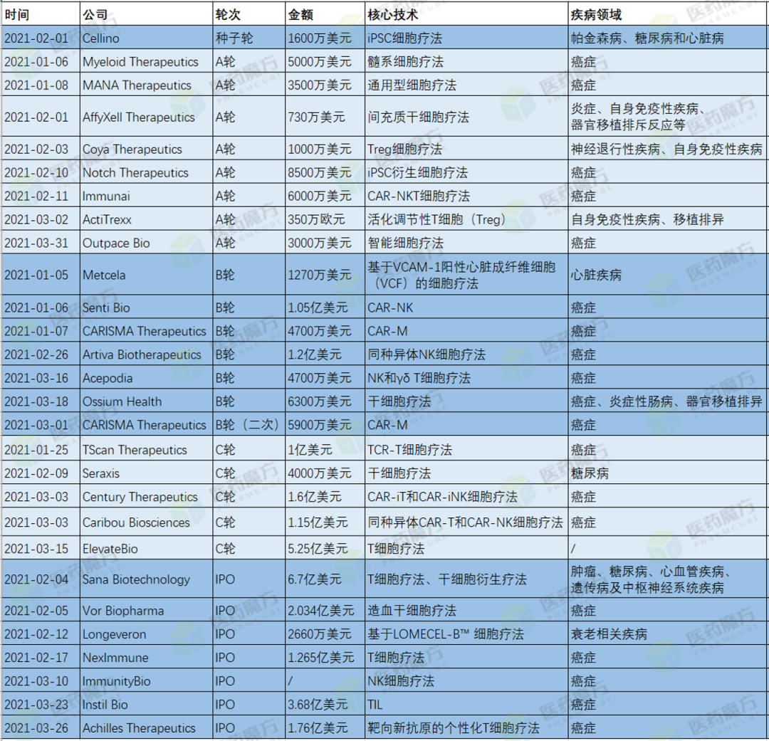 根据医药魔方PharmaInvest数据库,2021年第一季度全球细胞疗法领域共发生近40起融资事件(包括IPO融资),总融资金额超过37亿美元。