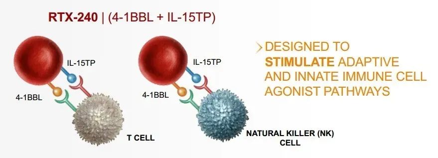 RTX-240是一种异体现货型细胞疗法,旨在同时呈现数十万个共刺激分子4-1BBL和IL-15TP,从而激活和扩增NK细胞及记忆T细胞,增强机体免疫力以杀死肿瘤细胞。(来源:Rubius Therapeutics官网)