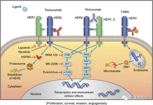 Her2在结构上属于开放式构象, 一直处于活化状态,且不具有可溶性特异配体。在正常细胞中Her2的表达水平极低, 但在胚胎发育期表达量很高, 可以自发形成同二聚受体或配体诱导形成异二聚受体, 触发信号转导网络对细胞的增殖、分化、发育、黏附及迁移起重要的调节作用。在10%~34%的乳腺癌、卵巢癌、胃肠道癌症和肺癌等多种癌症中都存在Her2基因扩增或过表达的现象, 特别是在乳腺癌中已是公认的预测因子和治疗靶点[1]。Her2高表达肿瘤表现出极强的迁移性和浸润性、化疗药物敏感性差、愈后差、易复发等特点。目前已上市针对Her2的靶向药物几十余种,在研种类包括小分子抑制剂、单克隆抗体、双特异抗体及抗体偶联药物(ADC)、细胞疗法、肿瘤疫苗等,显著提高了患者生存率及中位生存期,成为实体瘤治疗的典范。