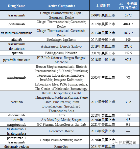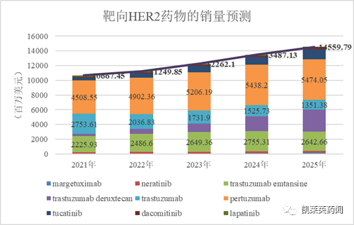据不完全统计,目前已上市的靶向HER2药物全球销售规模超过126亿美元。其中trastuzumab(曲妥珠单抗)和pertuzumab(帕妥珠单抗)近一年销量最高,ADC药物trastuzumab deruxtecan未来的增长趋势最显著。