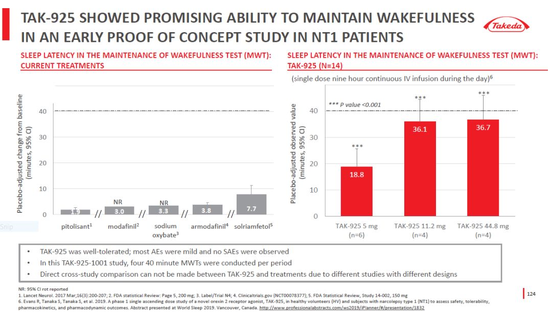 此前,这款药物的静脉输注剂型TAK-925在概念验证1期临床试验中,表现出维持NT1患者清醒的疗效。