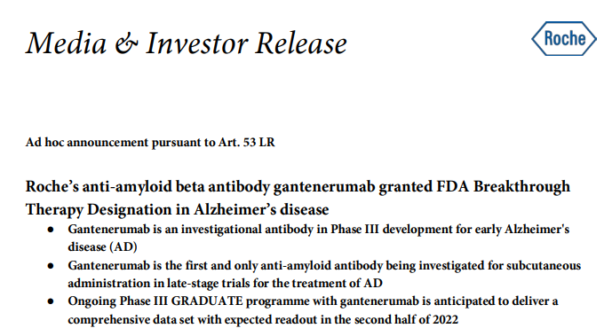 10 月 8 日,罗氏宣布皮下给药的抗淀粉样蛋白 β 抗体 Gantenerumab 已获得美国食品和药物管理局 (FDA) 的突破性疗法认定,用于治疗阿尔茨海默病 (AD) 患者。