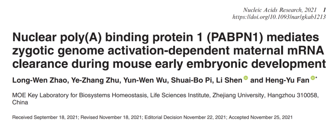 2021 年12 月14日,浙江大学范衡宇课题组在Nucleic Acids Research上发表论文:Nuclear Poly(A) Binding Protein 1 (PABPN1) Mediates Zygotic Genome Activation-dependent Maternal mRNA Clearance During Mouse Early Embryonic Development。鉴定PABPN1为一个合子表达的母源mRNA去稳定因子,并揭示了其在哺乳动物早期胚胎发育过程中的细胞质新功能。