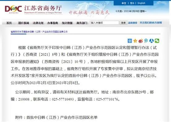 根据苏商资【2021】8号《省商务厅关于印发中日韩(江苏)产业合作示范园区认定与管理暂行办法(试行)的通知》,认真研究制定深化与日韩产业合作的建设实施方案,进一步梳理发展优势。