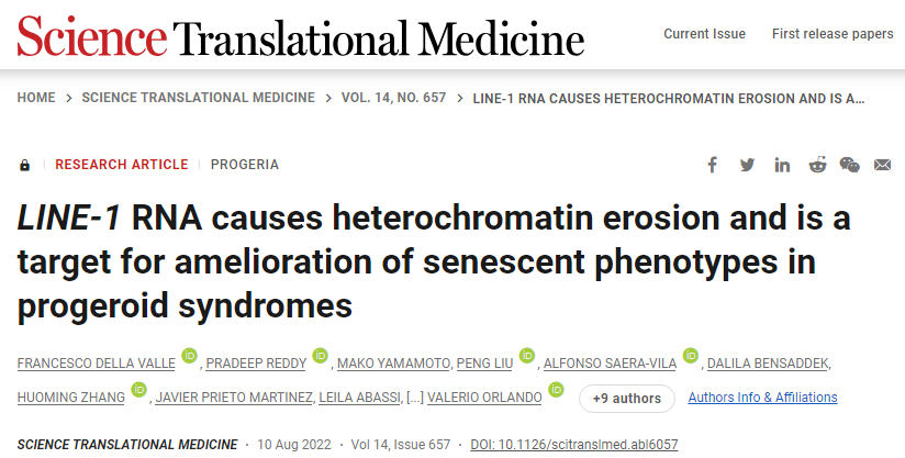 Francesco Della Valle, Pradeep Reddy, Mako Yamamoto, et al. LINE-1 RNA causes heterochromatin erosion and is a target for amelioration of senescent phenotypes in progeroid syndromes, Science Translational Medicine (2022). DOI: 10.1126/scitranslmed.abl6057