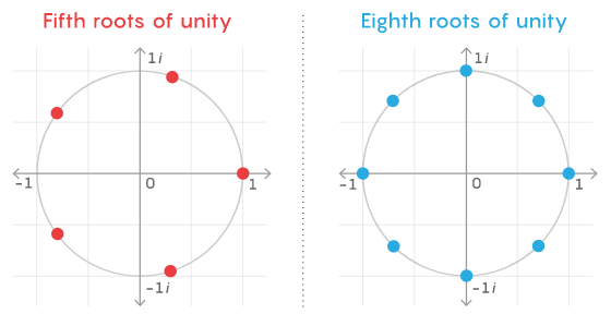 单位根是一个看似简单却非常重要的概念。数值上,它们是多项式的解,其中,变量的幂被设为 1。比如, x^5 = 1 或者 x^8 = 1。这些解是复数,它们由指数中的数字表示。例如,5 次单位根就是 x^5 = 1 的五个解。