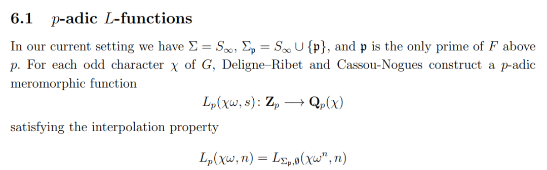 p - 进数 L 函数。两位教授通过 Deligne–Ribet 和 Cassou-Nogues 构造了一个 p 进数亚纯函数,并满足插值性。