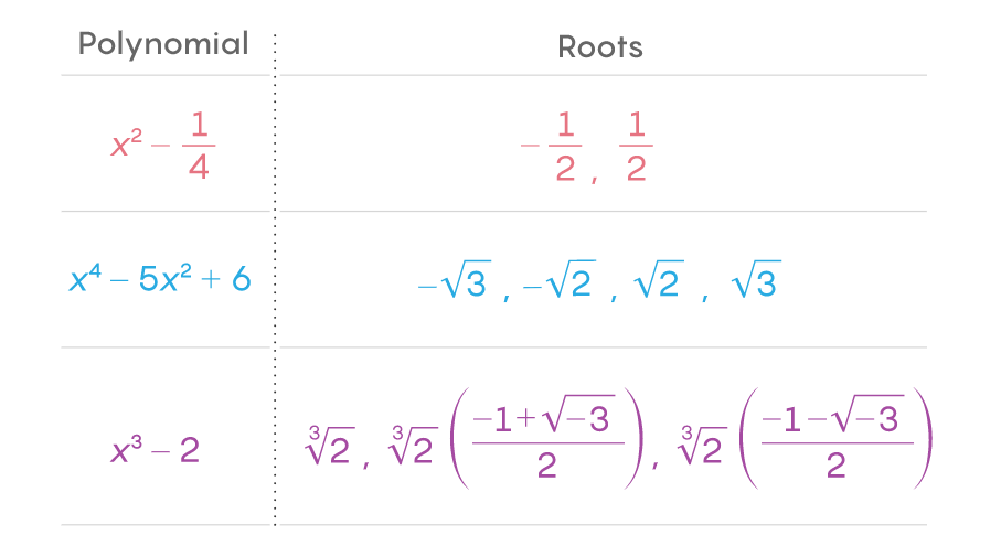有时有理系数多项式的根本身就是有理数,但情况并非总是如此。这意味着数学家想要找到所有有理数多项式的根,需要在一个展开的数系统中寻找:复数,包括所有有理数和实数,加上虚数 i。