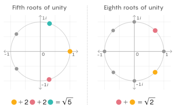 19 世纪,在希尔伯特提出数学问题清单之前,数学家们发现,单位根可以作为他们想要研究的特定数字集合的「构建块」:具有有理系数的阿贝尔多项式的根。如果你把单位根简单地组合(用有理数加、减、乘)起来,你就能描述出所有这些期望的根。例如,5 的平方根是阿贝尔多项式 x^2-5 的根,并且可以表示为不同五次单位根的和。这与素数构建整数块的方式类似。