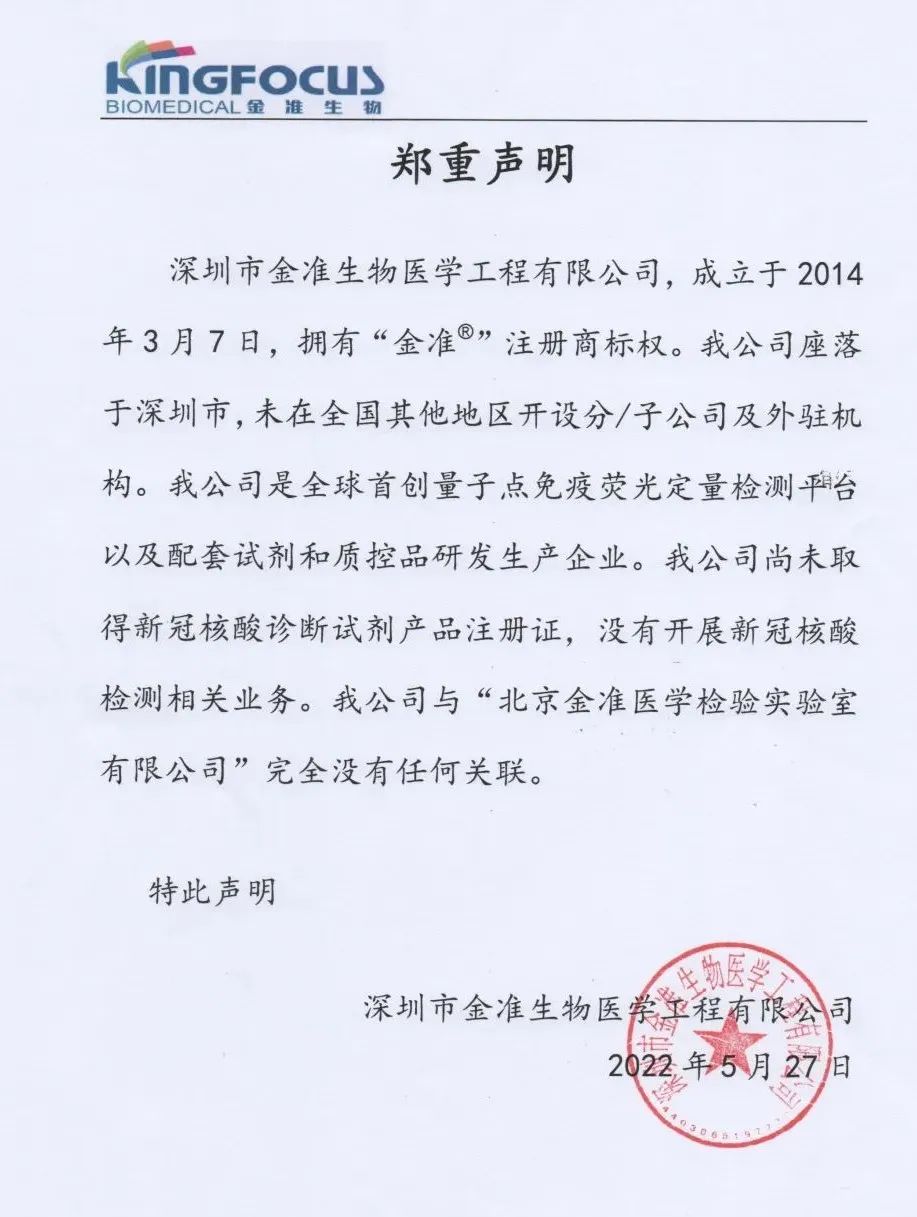 同为“金准”,IVD行业另一家企业深圳市金准生物医学工程有限公司却无辜躺枪,被不少客户问候是不是有关联。为此,深圳金准特地发布声明,表示两者没有任何关联。