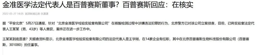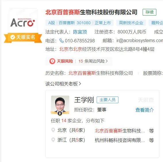 公开信息显示:被查获的实验室法定代表人王学刚系创业板上市公司百普赛斯董事,在14家企业有任职。