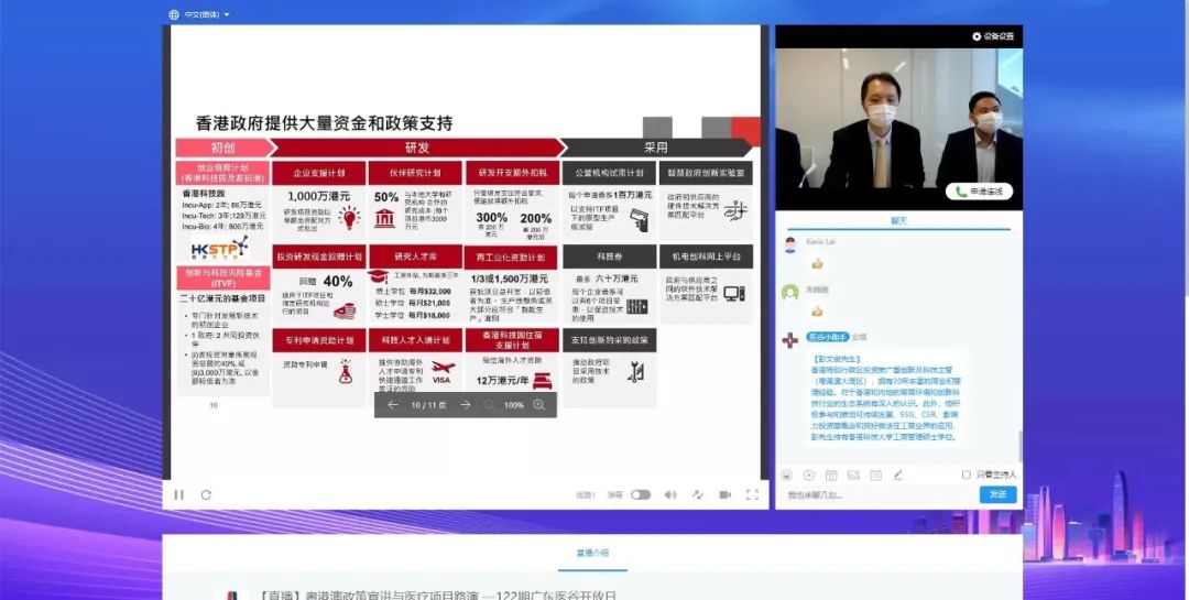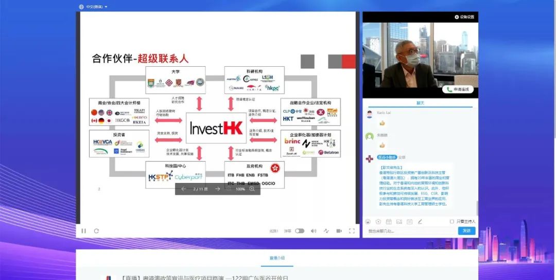 香港特别行政区投资推广署创新及科技主管彭文俊作了“香港可创投资环境及商机的主题分享。香港拥有知名的跨国制药公司进驻,全球20大制药公司已经在香港设立公司,跨国制药公司在香港进行临床试验,汇聚产业政策、人才资源、研究能力等生物医药发展优势。香港政府于2018/2019香港财政预算案预留100亿元支持在香港科学园建设医疗科技创新平台和人工智能及机械人科技创新平台,旨在吸引世界顶级的科研机构和科技企业来港,为香港汇聚及培育更多优秀的科技人才,连同本地大学及科研机构进行更多研发合作项目。香港特别行政区投资推广署是香港特别行政区的政府部门之一,一直积极鼓励有意在香港设立公司或拓展业务的海外及内地企业、中小型企业及跨国公司以香港作为业务发展的首要据点。投资推广署的代表遍布全球多个重要的商业城市,确保为投资者提供快速便捷、完善可靠的服务。