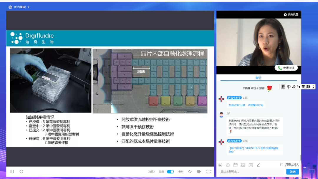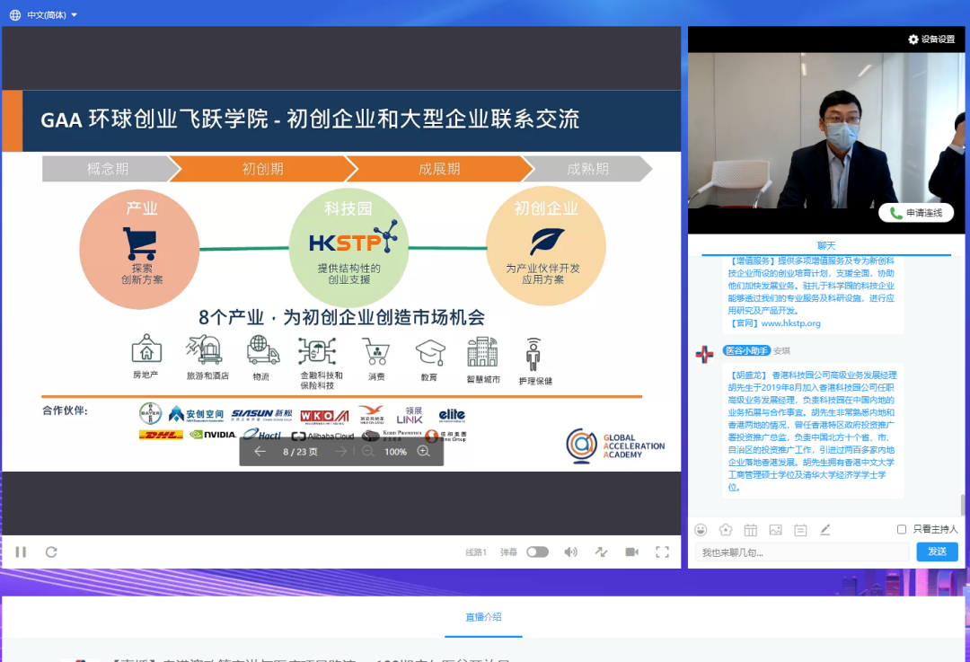 香港科技园公司高级业务发展经理胡盛龙介绍了香港科技园的科创生态及如何融入打完去的发展战略与布局。香港科技园自成立以来,通过发展重点科技领域,包括生物医药、电子、绿色科技、资讯及通讯科技、物料与精密工程,带领香港成为地区的创新及科技枢纽。香港科技园为科技公司提供科研设施及基础建设,设置市场主导的实验室及技术中心并附设技术支援服务。通过融合香港科技园与私人投资者的丰富资源成立香港科技园创投基金,以专业力量助创科企业把创新技术落地到应用领域,全力支持创新科技发展 , 培育本地科技初创公司, 创造改变世界的机遇。