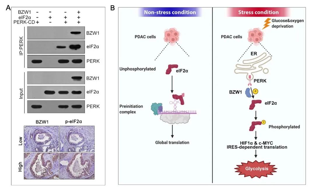 研究人员通过临床及实验数据,发现BZW1分子对维持胰腺癌实体肿瘤细胞在低糖乏氧微环境(Glucose-Oxygen deprivation microenvironment)中存活、生长起到关键作用。BZW1分子通过促进eIF2α与其激酶PERK的结合,促进eIF2α的磷酸化从而促进糖酵解关键蛋白HIF1α及c-MYC的翻译,进而显著地促进了胰腺癌细胞的糖酵解能力。该研究揭示了胰腺癌代谢重编程的关键调控基因,阐明了胰腺癌应答低糖乏氧环境的新机制,提出了胰腺癌的治疗新靶点。