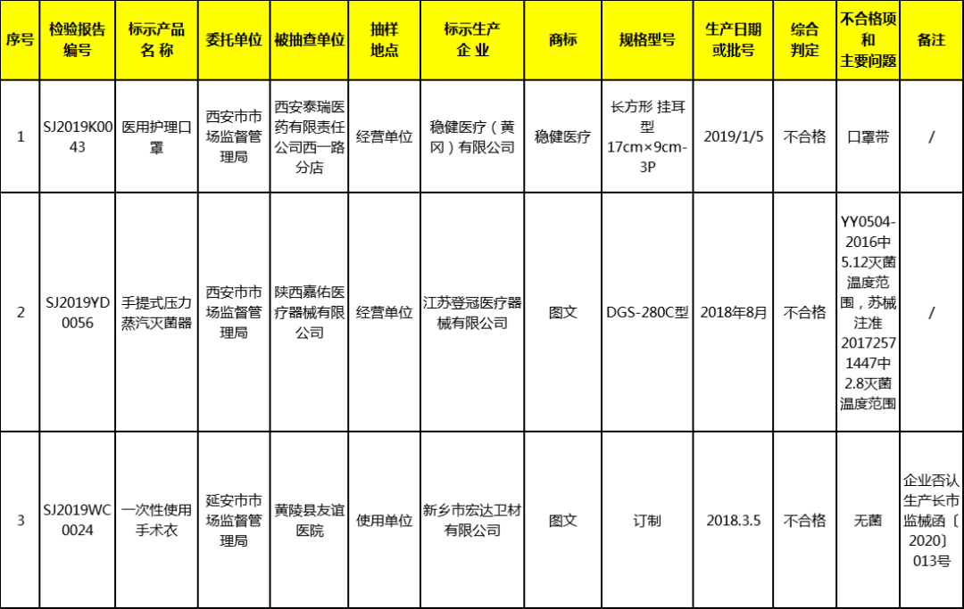 标示为稳健医疗(黄冈)有限公司生产的医用护理口罩因口罩带不合规判定为不合格;标示为江苏登冠医疗器械有限公司生产的手提式压力蒸汽灭菌器因灭菌温度范围标注不当判定不合格;标示为新乡市宏达卫材有限公司生产的一次性使用手术衣因无菌项不达标判定为不合格,不过该企业否认产品为其生产。更多详情见下表: