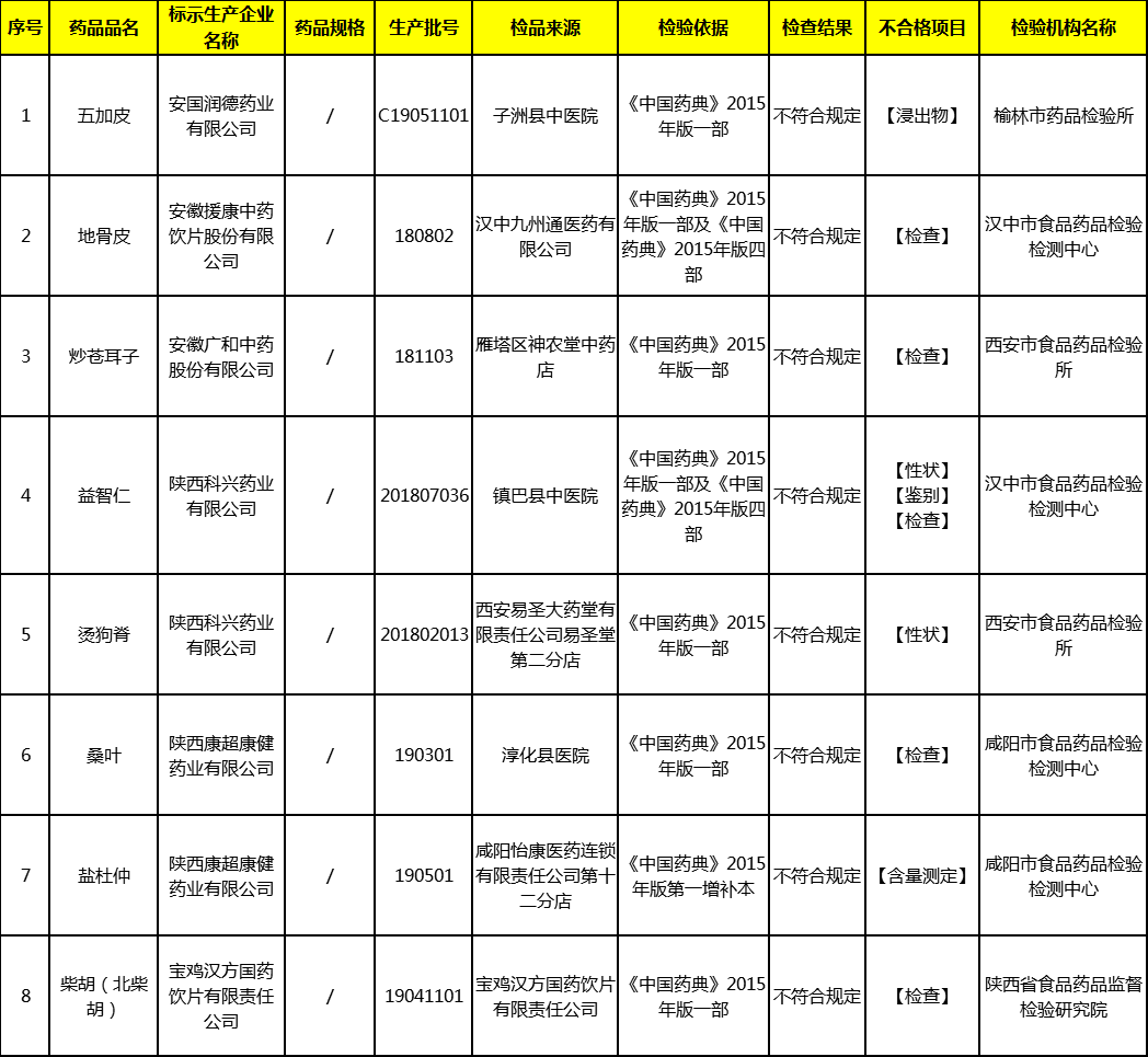 查处的不合格药品也全部为中药饮片,其中包括五加皮、地骨皮、炒苍耳子、益智仁、烫狗脊、桑叶、盐杜仲、柴胡(北柴胡)。标示的生产企业涉及6家药企:安国润德药业有限公司、安徽援康中药饮片股份有限公司、安徽广和中药股份有限公司、陕西科兴药业有限公司、陕西康超康健药业有限公司、宝鸡汉方国药饮片有限责任公司。
