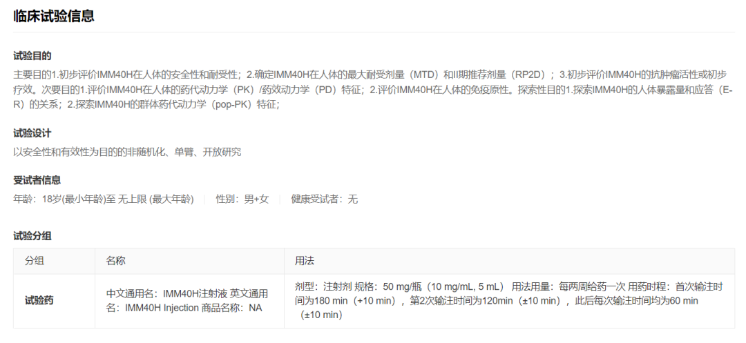 据 Insight 数据库显示,IMM40H 今年 6 月刚刚在国内首次递交临床试验申请,8 月末获批临床,今日已经启动首次人体 I 期临床试验,成为了国内首款启动临床试验的 CD70 单特异性抗体。