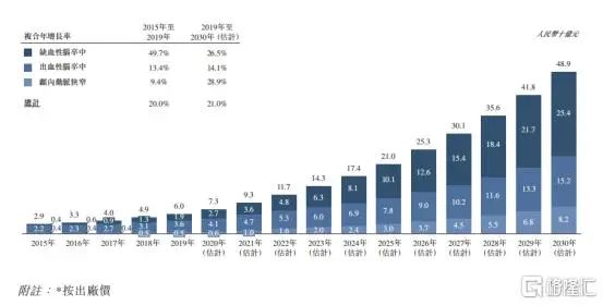 目前在中国,脑卒中的发病率高,死亡率极高。根据灼识咨询的资料显示,2019年中国的脑卒中患者人数达1480万名,位居全球第一,包括1190万名缺血性脑卒中患者及290万名出血性脑卒中患者。