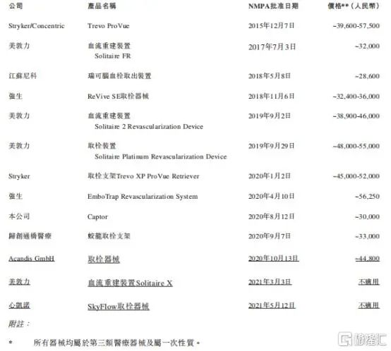 目前为止,中国及全球并没有颅内DEB导管获准上市。根据注册资料显示,归创通桥医疗与2021年7月在FDA注册了雷帕霉素颅内DEB导管的一项临床试验,预计于2023年3月前完成。但本公司的雷帕霉素颅内DEB导管已经进入临床试验,由中国科学技术大学第一附属医院领头,预计于2022年完成实验并提交NMPA注册申请取得批文,预期将是全球首家提供雷帕霉素颅内DEB导管的公司。