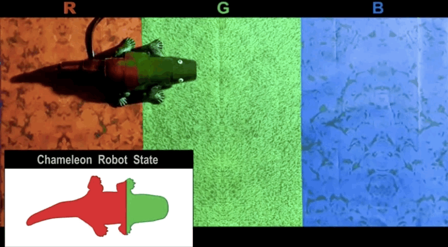 比如,在树林中同时激活两个加热器,变色龙机器人既改变了颜色又加上了曲线图案(模仿周围草地的纹理),