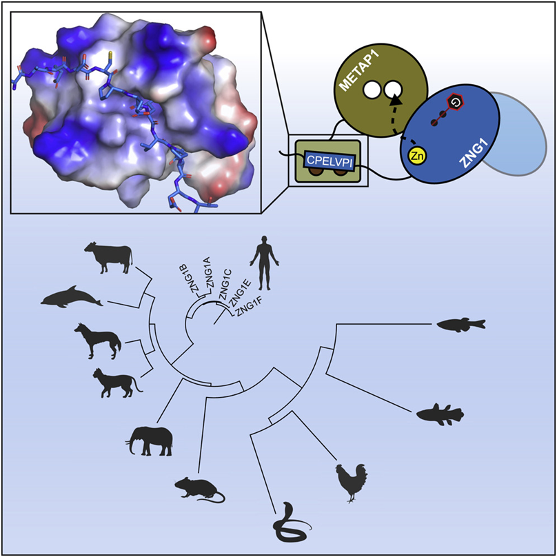 这些作者发现,ZNG1从酵母到人类都是保守的。他们用人类、小鼠和斑马鱼版本的ZNG1作为“诱饵”来发现与ZNG相互作用的蛋白,确定了METAP1酶是锌放入的一种客户蛋白,并全面描述了它与ZNG1的相互作用。METAP1去除大约一半新合成的蛋白上的初始氨基酸,有助于蛋白的稳定性、成熟和细胞定位。