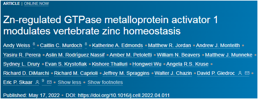 1. Andy Weiss et al. Zn-regulated GTPase metalloprotein activator 1 modulates vertebrate zinc homeostasis. Cell, 2022, doi:10.1016/j.cell.2022.04.011.