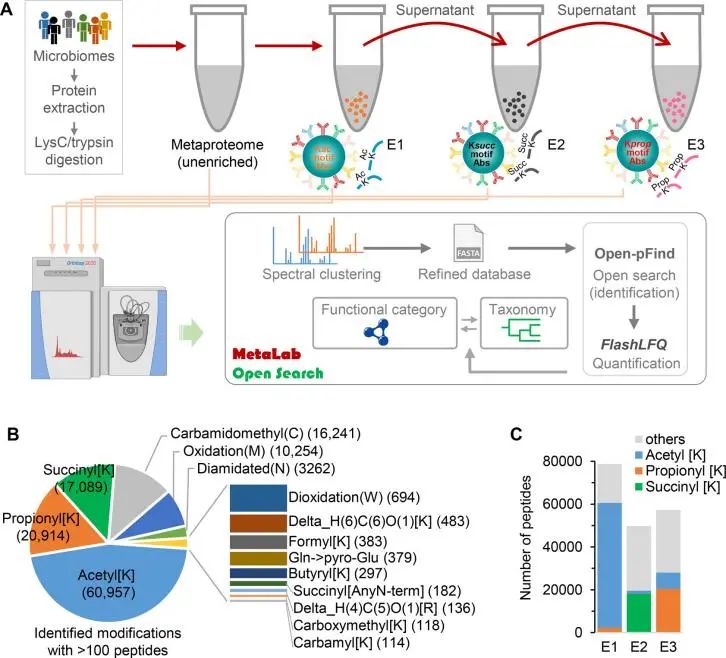 近日,Daniel Figeys团队在国际著名期刊analytical chemistry上发表了题为“Exploring the Microbiome-Wide Lysine Acetylation, Succinylation, and Propionylation in Human Gut Microbiota ”的研究论文。研究人员使用基于质谱的宏修饰组学(包括乙酰化、丙酰化、琥珀酰化)对人类肠道菌群样本进行了系统表征。研究发现赖氨酸酰化修饰在人类肠道菌群中广泛存在,不同的赖氨酸酰化修饰水平在具有不同代谢能力的微生物种属中特异分布,表明了宏修饰蛋白组学技术对微生物组物种分布及功能研究的重要价值。